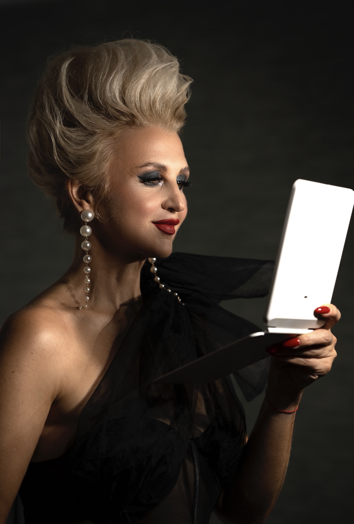 A beauty with a mirror in her hands and a high hairstyle: