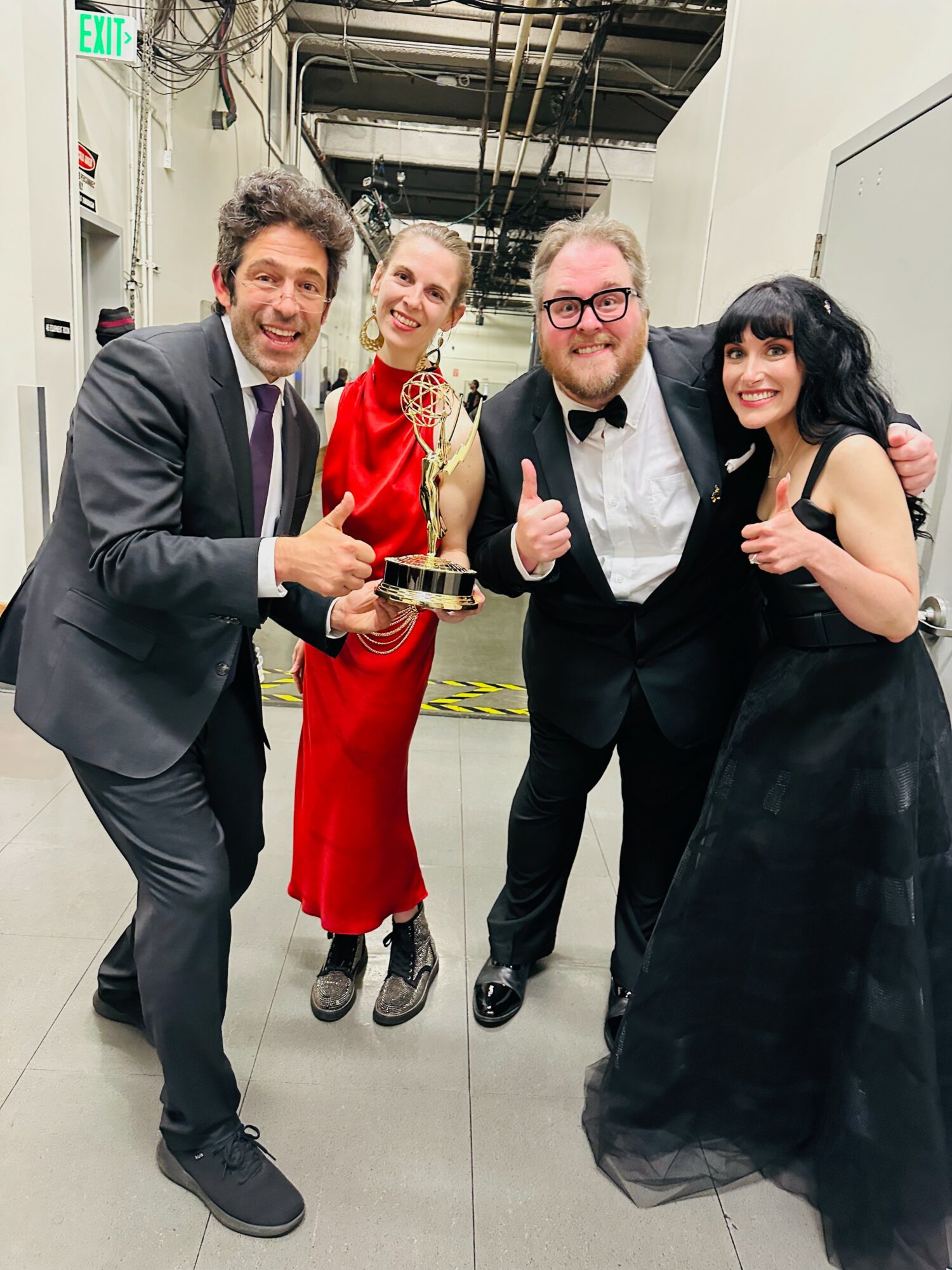 My second red dress moment came a decade later at the 2025 Emmys, as an Animatic Editor on Storybots for Netflix, this time with a tiny Storybot character (Boop!) pinned to the fabric, standing alongside my team as we graciously accepted our award.