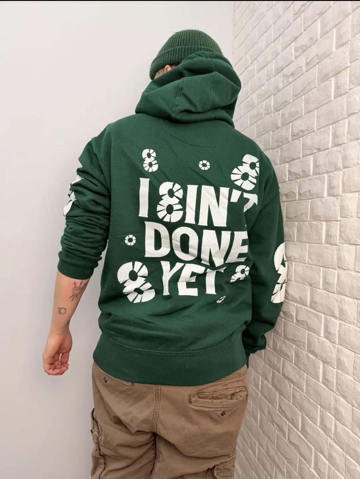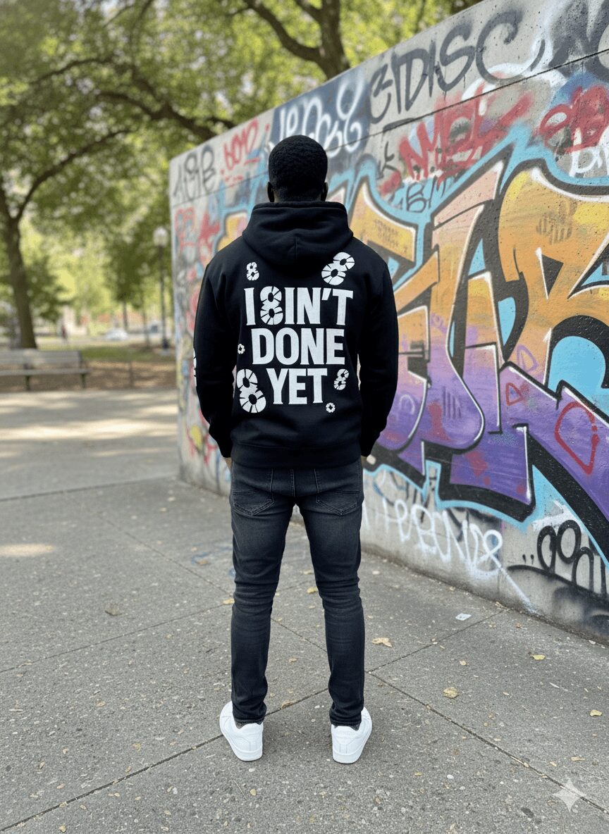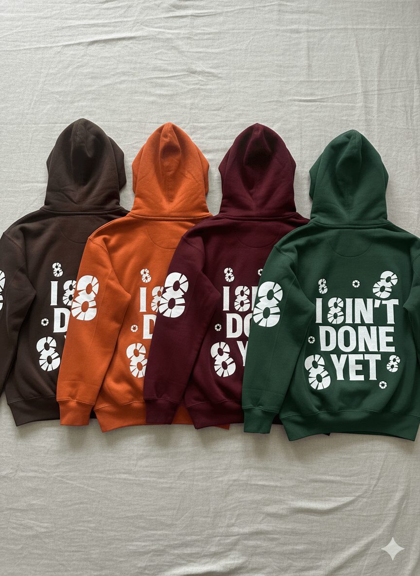 PH8SES is special because it’s not just clothes — it’s storytelling. It’s a mindset. It’s what you wear when you’re rebuilding, when you’re still fighting, when you’re becoming the version of yourself that doesn’t quit. Each drop is tied to a specific phase of the journey. My new fall release, “I 8in’t Done Yet,” represents resilience and the grind — that moment when you’re tired but you keep going because you know you’re not finished yet.