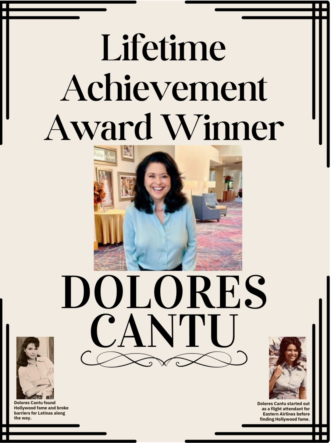 Hollywood lived in her heart, sparked by the trailers she watched at the theatre. At 19, she moved to Houston. At Prudential Insurance, she was crowned Miss Debt Clerk—judged not for beauty, but for courage, vision, and her desire to change the world. That same fire caught the attention of Eastern Airlines, and at just 20 years old, she became the first Mexican-American flight attendant in 1970.