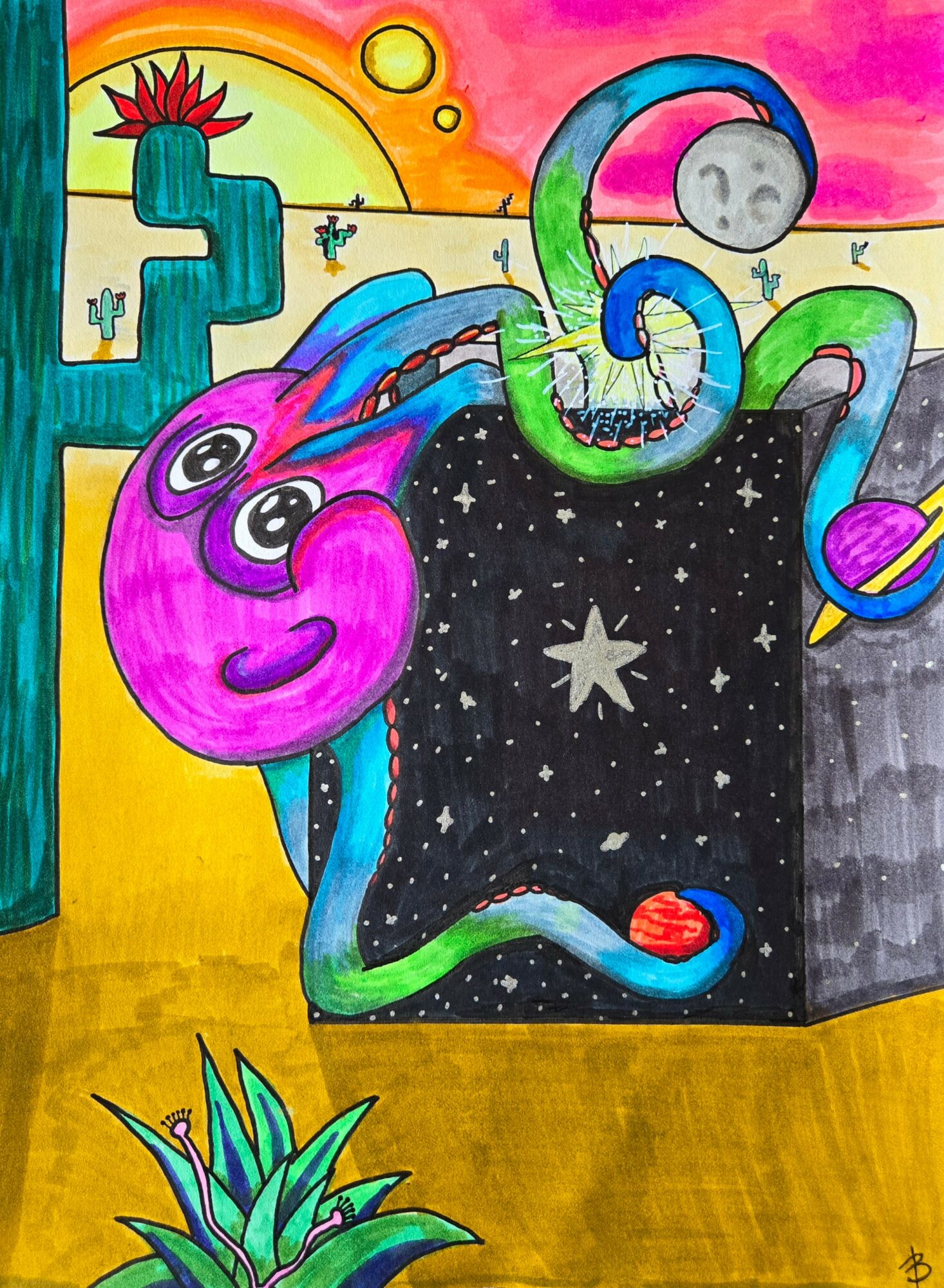 Right now, Im working on about 10 different projects: a few digital pieces, a few marker art pieces and am also up-cycling some old clothes by adding fabric painted art to them.