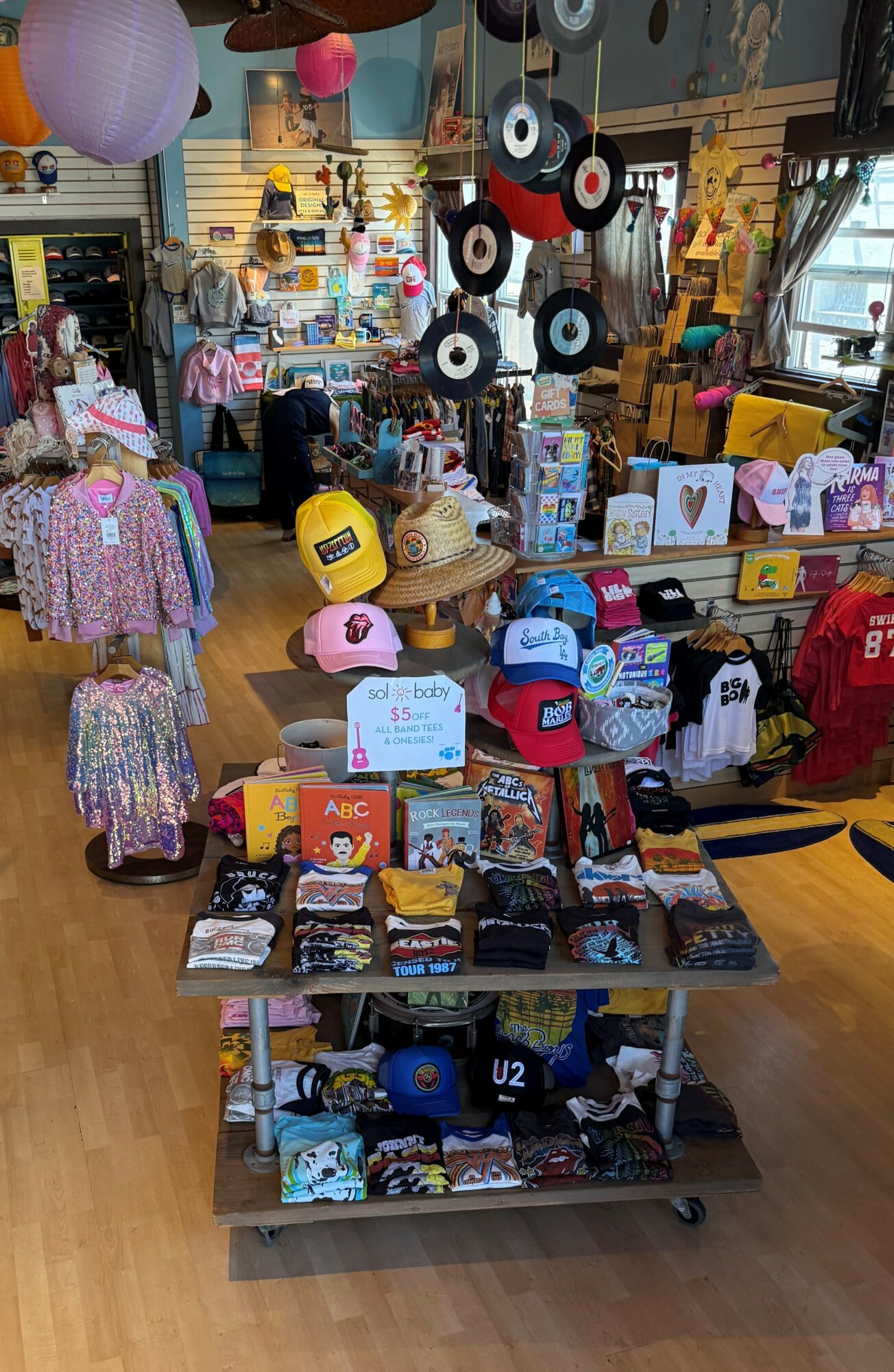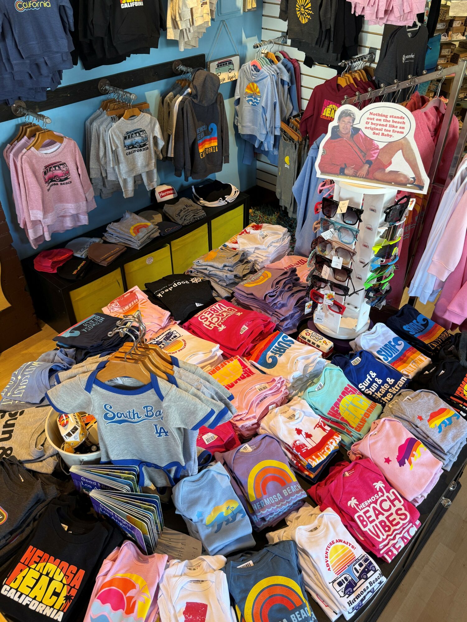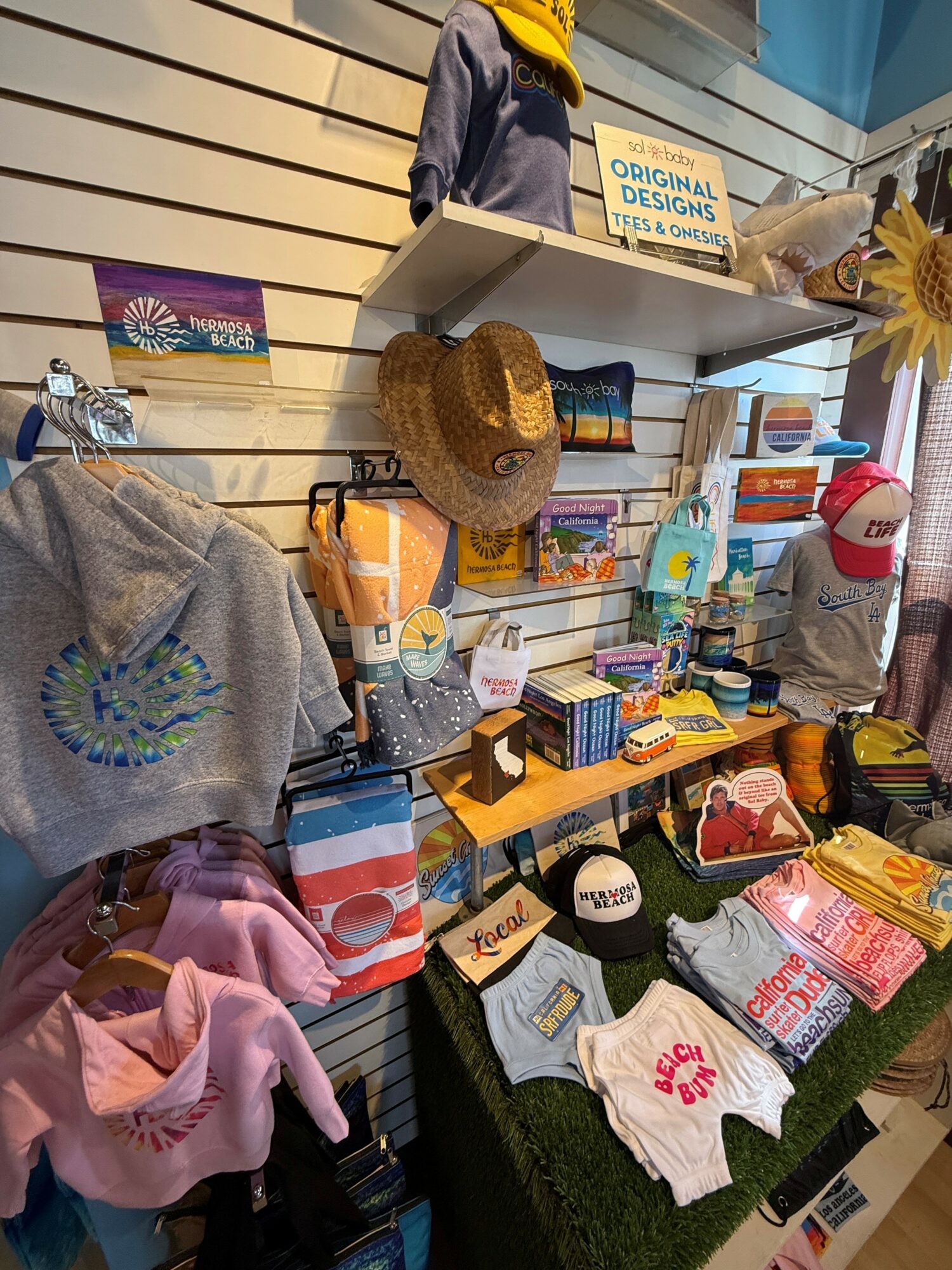 My name is Gina Rothwell and my husband Dave and I own Sol Baby, a baby/kids boutique in Hermosa Beach for the past 18 years. I truly believe we have a super unique, one of a kind kids shop! First of all, it’s in the most historic building in downtown Hermosa Beach on Pier Avenue, a place that housed some of the most iconic shops in this city. We have tried to stay true to Hermosa’s colorful, quirky, music and surf themed culture that established this city’s awesome vibe it is today. Within our own brand, we have created a large line of graphics from trendy mermaids and sharks to Hermosa, California and South Bay love designs that we print on onesies, tees, hoodies, trucker hats and more. I also curate an assortment of some of the hottest kids brands and styles that I find. We have not only had the brick and mortar for over 18 years, our website sol-baby.com has been running for 17 of those years, as well as having Etsy and Amazon storefronts. We have fairly recently entered the realm of wholesaling our designs and finding some success in that. Having other top tier kids stores from Los Angeles to Colorodo order from us is quite a special feeling that we are very proud of.