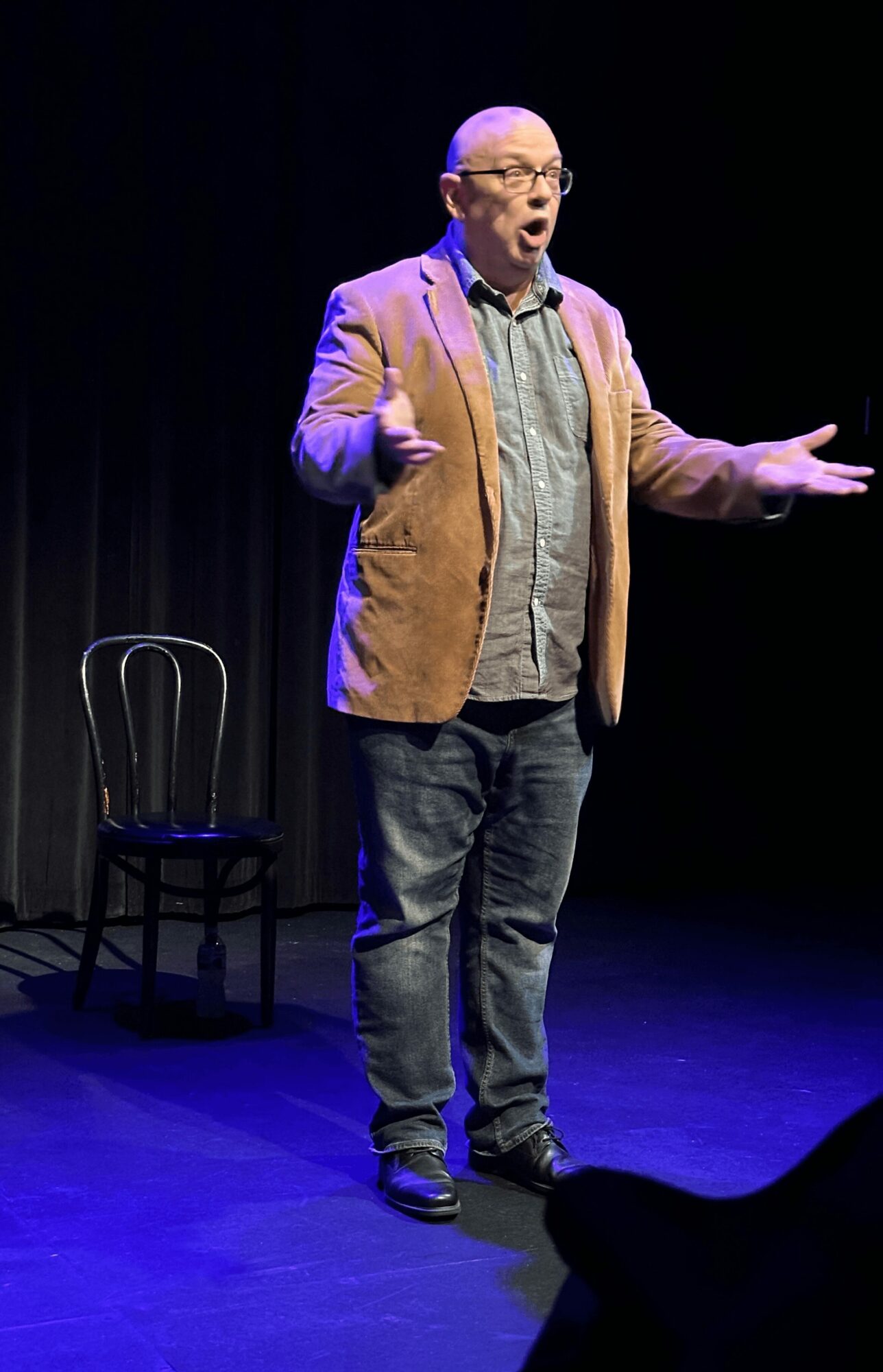 Hello, I’m Jim McCaffree. I’m an actor in LA (sometimes), a copyeditor, and a pet sitter. Recently I’ve decided to focus on the “other” thing I’ve been good at: writing. I started writing and performing standup, freelance writing, and writing my solo comedy show, “Jim McCaffree: National Treasure,” a combination of standup comedy and character monologues. I premiered it at Whitefire Theatre’s Solofest 24 in LA (winning an Encore Award); I also performed it Off-Broadway, in the United Solo festival.