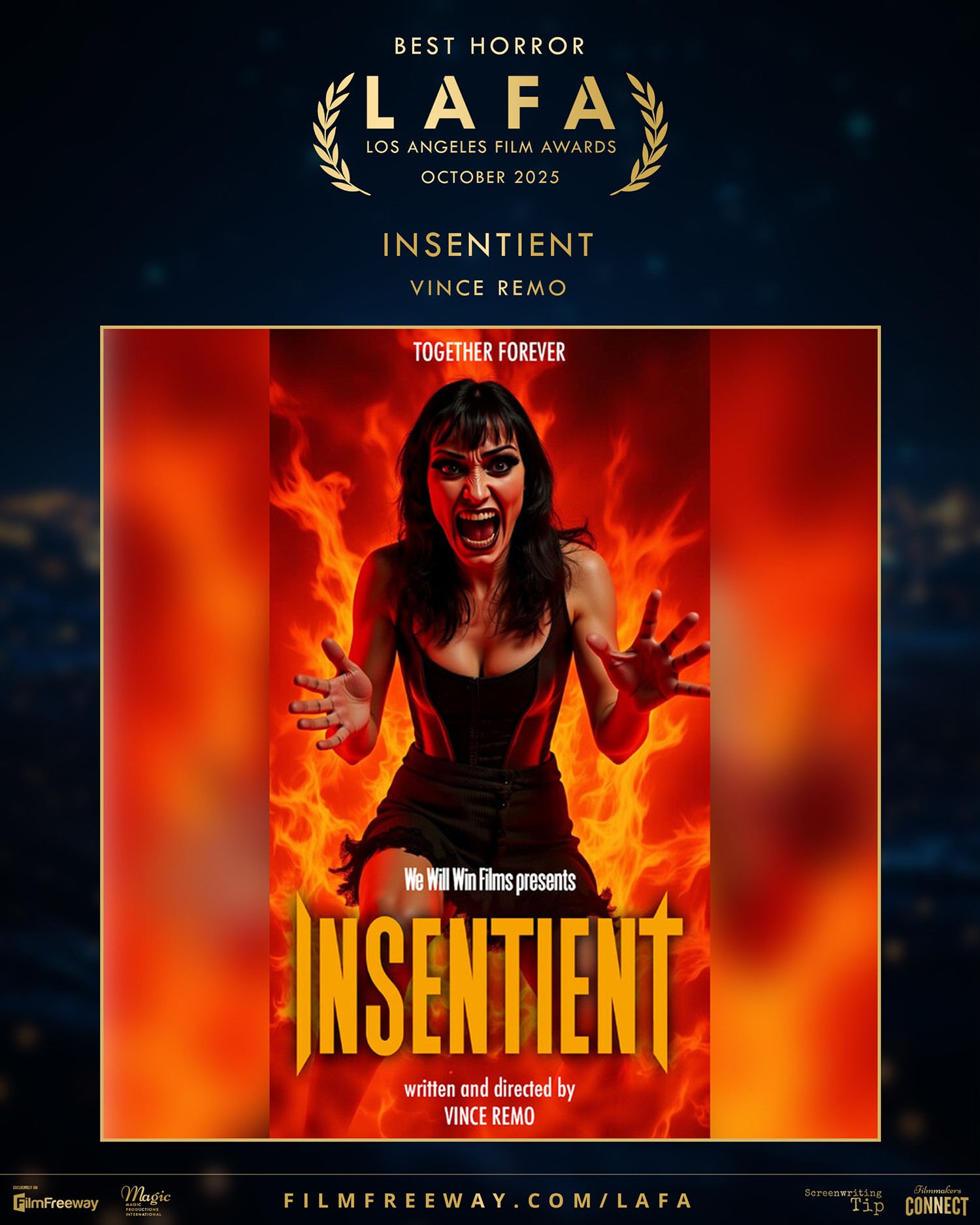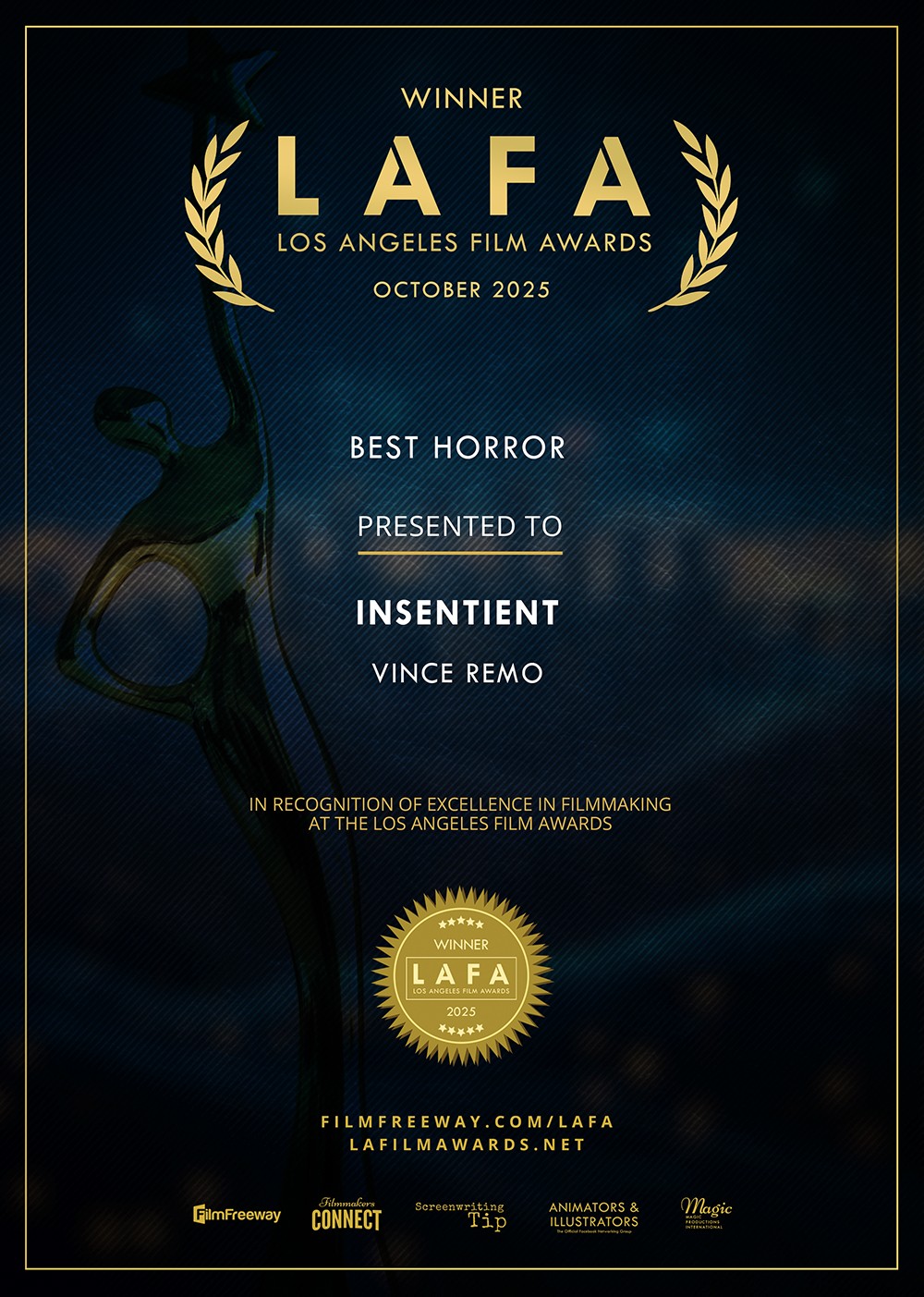 I am a Film Maker who has been blessed with so many talents and skills. Skills such as Music, Illustration, Photography, Animation, Poetry and Video Production. Most of these skills I have turned into a career and have all been used into my last Film ‘Insentient’. I am currently self employed using my talents off of gigs. I am currently working on another short called ‘Exodus’ and working on the feature length version of ‘Insentient’ for which I just finished a 120 page script. The proof of concept short of ‘Insentient’ currently won Best Horror at the Los Angeles Film Awards and got selected for 2 categories at the Indie Short Fest for Best Horror and Best Original Screenplay.